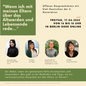 Im November 2021 fand der Fachtag „Vietnamesisches Berlin: Älterwerden vietnamesischer Berlinerinnen und Berliner (2)“ statt, der sich in erster Linie an Angehörige (erwachsene Kinder) richtete. Der Fachtag diente zur Informationsvermittlung in verschiedenen Themenbereichen, bot aus zeitlichen Gründen wenig Raum für ausgiebige Diskussionen, so dass viele Fragen offen blieben. Nun wollen VIA und VCARE* zusammen alle […]